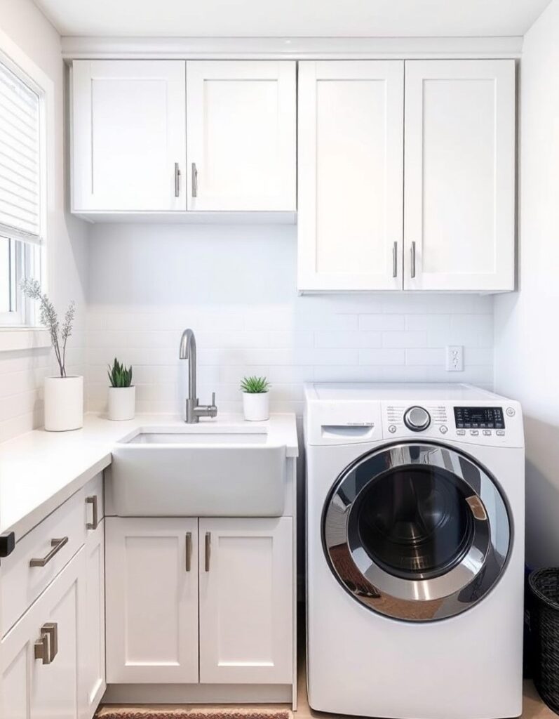 Storage integration enhances functionality. Install shelving or cabinets around the sink area to store cleaning supplies, hand-washing detergents, and other laundry essentials within easy reach.