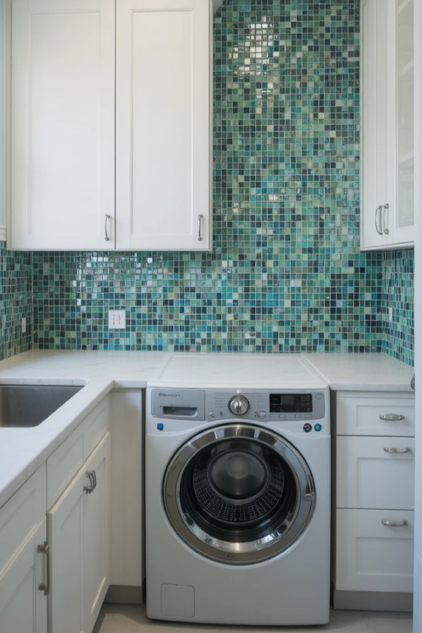 Glass mosaic tiles reflect light, making compact laundry rooms appear brighter and more expansive. Select iridescent or frosted finishes for a subtle gleam, or choose bold colors to establish contrast. Suggestion: Install glass tiles behind wall-mounted shelves for a layered effect.