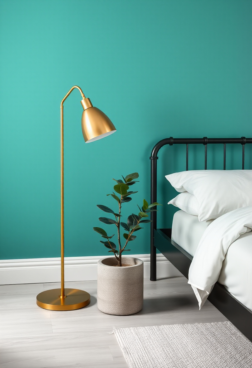 Match teal walls with brass highlights and industrial-inspired furnishings, such as metal bed frames and exposed lighting fixtures. This pairing creates a bold, sophisticated look that balances style and functionality.