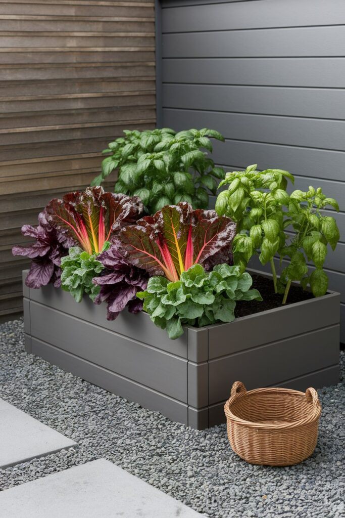 Consider plants like rainbow chard, purple cabbage, and ornamental peppers that provide both food and visual appeal.