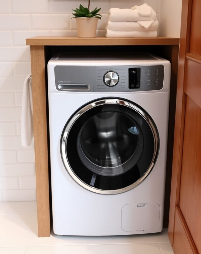 Use the space above your washer and dryer for a countertop or shelf that provides folding space and additional storage. This surface becomes essential for managing clean laundry efficiently.