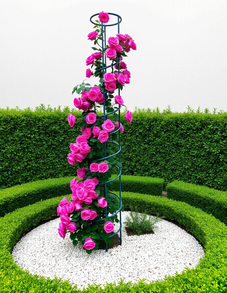 Spiral rose-covered trellises offer unique three-dimensional growing surfaces that showcase roses from multiple angles. These structures typically use metal frameworks with spiral wire or slat arrangements, allowing roses to climb in helical patterns around central supports.