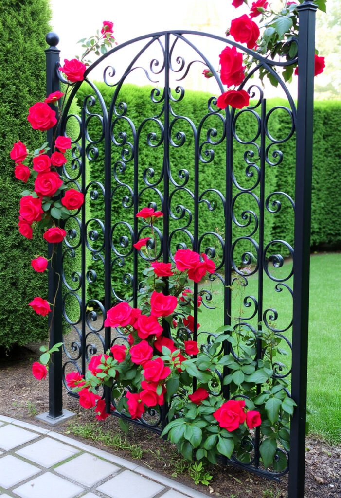 Wall-mounted fan trellises offer space-efficient solutions for rose-covered trellises in smaller gardens. These structures attach directly to walls or fences, spreading outward in fan patterns that accommodate natural rose growth habits. Fan trellises work particularly well for espaliered roses or compact climbing varieties.