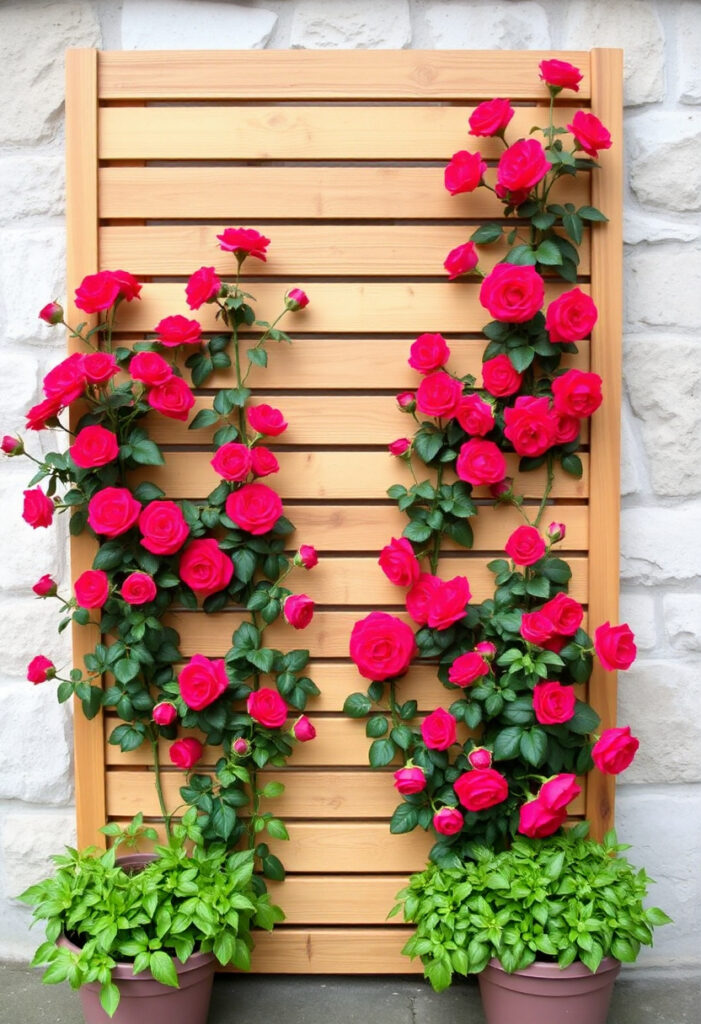 Vertical wall systems create rose-covered trellises that maximize growing space in minimal footprint areas. These structures use closely spaced horizontal supports that allow roses to create dense, wall-like plantings. Vertical walls work well for privacy screening or hiding unsightly features.