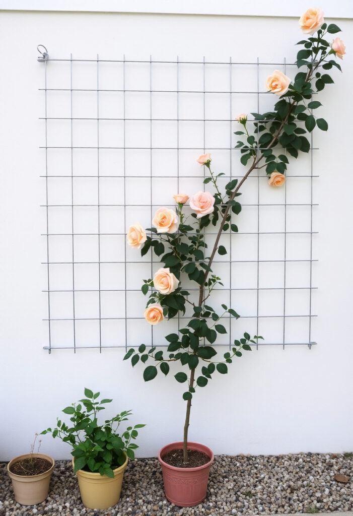 Simple wire grid systems provide cost-effective solutions for rose-covered trellises. These minimalist structures use galvanized wire or cable arranged in grid patterns, offering roses plenty of attachment points without overwhelming the garden design. Wire systems work particularly well for modern garden settings where clean lines are preferred.