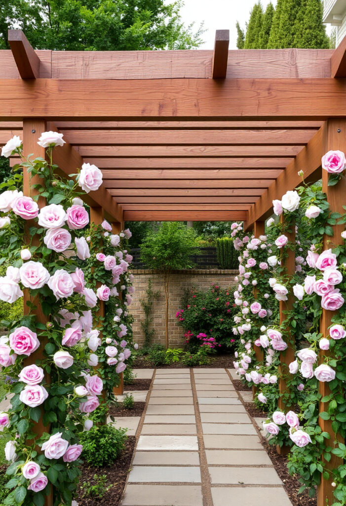 Structural requirements: Ensure pergola posts are sized appropriately for combined loads of structure, roses, and wind forces. Use galvanized hardware throughout and consider local building code requirements.