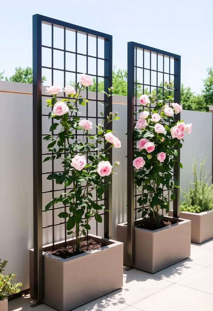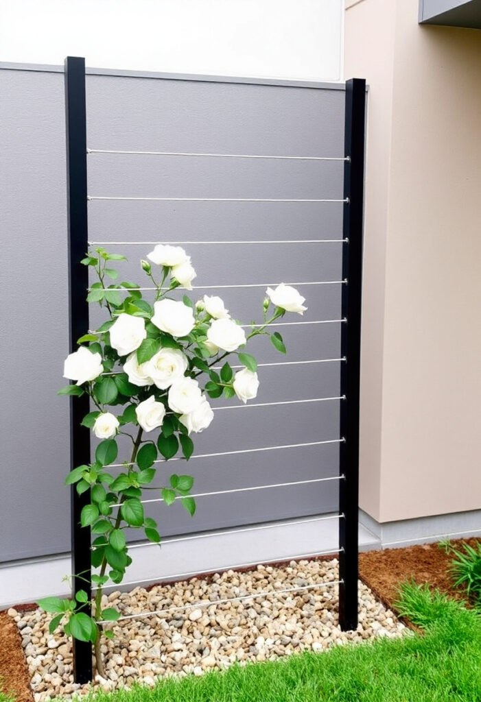 Modern tensioned cable rose-covered trellises provide minimalist support that virtually disappears once roses mature. These systems use stainless steel cables stretched between posts, creating horizontal or diagonal growing surfaces. Cable systems work exceptionally well for contemporary garden designs.