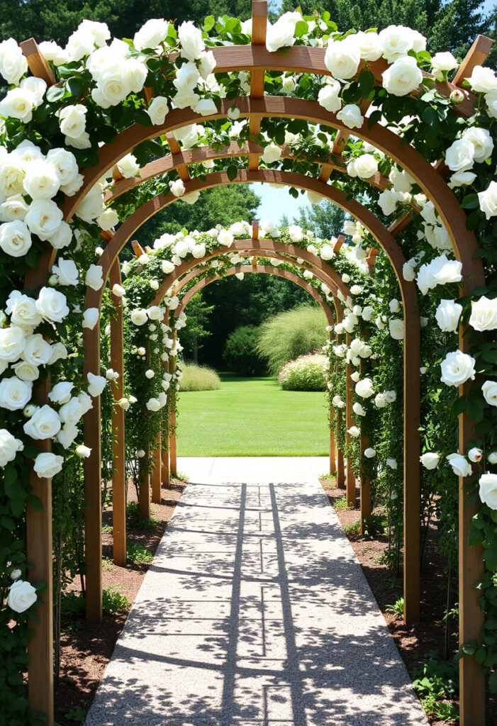 Arched rose-covered trellises create stunning garden passages that invite exploration while maximizing vertical growing space. These structures require careful planning to ensure adequate headroom (minimum 7 feet) while providing secure rose support. Multiple arches can be connected to form extended walkways.