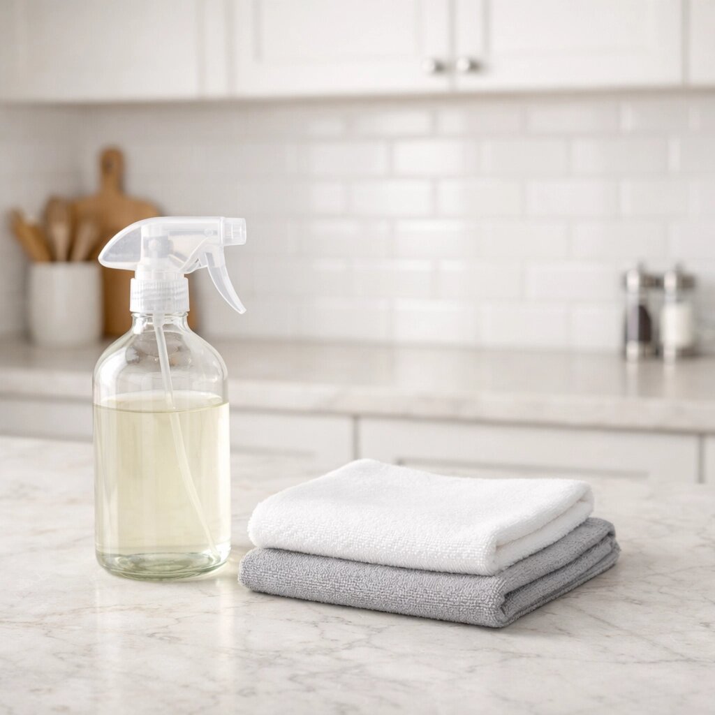 For routine surface cleaning, a damp microfiber cloth can handle most countertop, appliance-front, and cabinet-face tasks without additional product. This tends to reduce both product use and wiping time during the weekly cleaning pass.